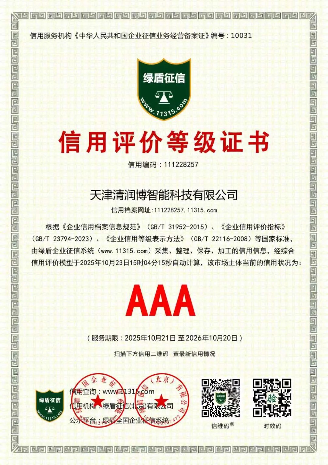 自成立以来,清润博始终秉持 “诚信为本、合规经营” 的理念,在业务开展中坚守契约精神,在行业发展中履行社会责任,积累了良好的市场口碑。此次荣获信用等级认证,是对过去的认可,更是对未来的期许。它必将驱动我们以更高标准,迈向新征程。